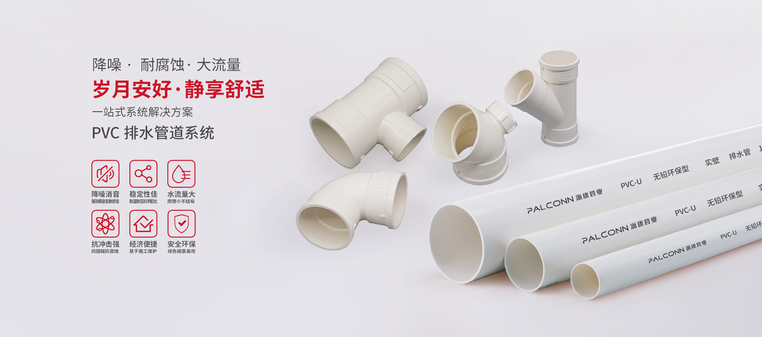 派康PVC-U排水系统,以超国标为标准,采用超优配方,实现高度抗冲击性、超长耐老化性,并在此基础上不断升级研发升级新产品,满足各种不同
